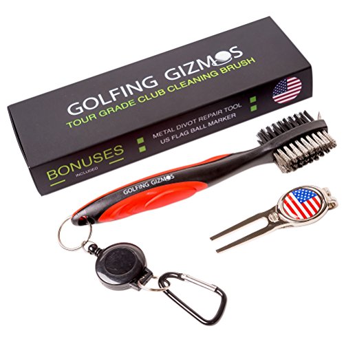 Golf Club Cleaner (Brush & Groove Spike) Plus Metal Divot Tool with US Flag Magnetic Ball Marker (3in1 Tool) High Quality Box. Perfect Gifts for Golfers - By Golfing Gizmos® Reviews